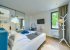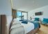 On the first floor there are three comfortable bedrooms with an air conditioning, flatscreen TV, king size beds, make-up tables and wardrobes with mirrors as well as two modern designed bathrooms with baths and rainshowers. Two bedrooms have private terrace with sea view and en-suite bathroom, the blue coloured bedroom with lounge corner with mountain view and no terrace. On the lower ground floor there is fourth bedroom with en-suite bathroom. On the same level you will find utility room, fitness equipment, treadmill, darts board, projector.