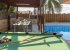 The dining area is sheltered by a wooden pergola and features a sturdy dining table seating 8, a classic stone BBQ for those alfresco dinners and a pool table for those who fancy a few games in the shade. Around the side of the house there is a garden where you will find the table tennis court and grass lawn with kids play area.