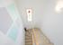 Very wide stairs going downstairs, furnished with a huge window that brings in some light down the staircase.