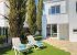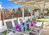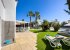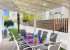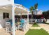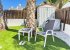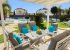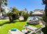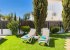 At the end of the garden is a fenced pool area with 8 sun beds and surrounded on one side by shrubs. Parasol with base, side table and outdoor lighting are also provided.