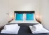 The twin room has divan beds, bedside cabinets with lamps, fitted wardrobes and windows with a blind.