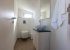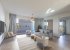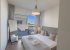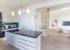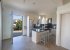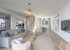 Upon entering the villa, you are welcomed into a bright and contemporary open-plan living, kitchen, and dining area. The stylish kitchen is fully equipped with all modern appliances and amenities required for short-term stays and features a central kitchen island with seating for two on bar stools. The dining area comfortably seats six guests, while the living room offers a comfortable arrangement of sofas and armchairs, creating a perfect space to relax and unwind. A guest toilet is also conveniently located on the ground floor.