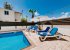 Step outside, and you'll discover the villa's large outdoor space, a true highlight of the property. The private pool invites you to take a refreshing dip, while the surrounding sunbeds offer the perfect spot for soaking up the Mediterranean sun. An outdoor dining area, complete with a table and chairs for six, provides the ideal setting for al fresco dining or evening drinks under the stars.