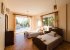 As you step into the villa via the large outdoor porch you will enter the bright, spacious living room/dining area. To the left there is the lounge featuring a comfortable corner sofa arrangement, a traditional stone working fireplace, glass top coffee table, flat screen TV with IPTV and french doors leading to the beautiful pool area.