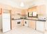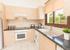 The dining area consists of an extendable wood dining table with 6 cream leather chairs. The light wood and black granite topped work surfaces are complimented by the white electric oven and hob, fridge freezer and washing machine.