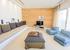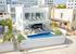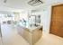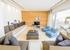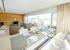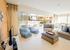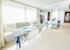 The open plan living adds to the already ample living space and the patio doors that run the whole width of the property offer stunning views of the pool area. Comfortable sofas are positioned around the large flat screen TV. A wood effect wall adds a lovely feature to the white décor.
