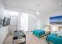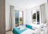 As you enter the villa, you will find the large and modern, open-plan kitchen, living room and dining area surrounded by patio doors that lead to the spacious pool and garden area. The living room features comfortable sofas and Satellite TV, the dining area has a table and chairs to seat 8 persons, and the kitchen is fully equipped with all appliances needed for a comfortable self-catering stay and includes an island with extra seating for 3 people. On the same floor there is a double bedroom with direct access to the veranda that overlooks the sea views