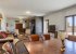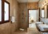 The bathrooms are decorated in tonal peach and feature glass-encased showers and dual sinks.