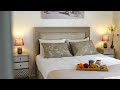 The main villa blends traditional Corfiot character with modern comfort, featuring high ceilings, wooden beams, and marble-style flooring.