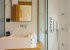 The two bedrooms are located on the first floor.The first has a double bed and en-suite bathroom with a shower. The second has two single beds and also en-suite bathroom with a shower. Both of the rooms have sea views. One extra person can sleep on the ground floor at a sofa bed.