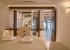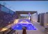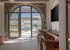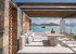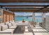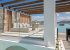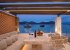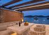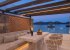 The outdoor space of the villa is equally captivating, offering picturesque views of the sea and hills. A small, pristine pool takes center stage, flanked by minimalist white walls and rustic stone detailing. Guests can enjoy the inviting seating area under a wooden pergola, which features a beautiful stone table, surrounded by cushioned benches and woven chairs. This tranquil setting is perfect for al fresco dining or unwinding as the sun sets over the horizon. The calm waters and anchored boats complete the scene, making the villa a delightful escape into the beauty of Elounda.