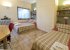 On the upper floor of this warm and inviting villa, there is an open plan living, dining and kitchen area, a bathroom, and two bedrooms.