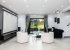 The living area is open concept and has a limitless amount of floor space, as well as greige quilted velvet sofas, glossy white armchairs, and matching pouffes. One side is dominated by a formal dining table and elegant black chairs, while the other is taken up by a projector screen that is ideal for gathering around to watch a movie.