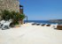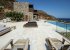 The brilliant blue ocean beyond and the largely cloudless skies contrast well with the stunning stone façade of the villa and the silvery stone terrace.