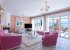This villa has two living areas, the first with retro plush pink sofas, peach walls, and glamorous yet understated chandeliers hanging from the ceiling.