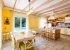 The kitchen is a lovely lemon yellow, with traditional art on the walls and a kitchen island.