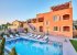 Exterior grounds include a large private saltwater pool, a barbecue and a Cretan stone oven, sun lounges, and a lawned area.