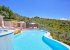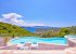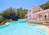 The exterior of the property features lush Mediterranean vegetation and a private pool, adding to the villa's allure.
