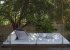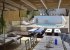 The living room opens directly onto the patio, which features a pool with a slide and a garden with cushioned sun loungers, a hammock, and bean bag chairs.