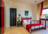Two enormous bedrooms, one with a double bed and the other with cozy twin beds, are located on the ground floor as well. Both have vibrant bathrooms, one pink and one red to match the bedrooms.