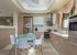 The contemporary sofas are neatly positioned and look out into the terrace and garden, while a handmade silver and Swarovski crystal lamp hangs dramatically over the dining table.