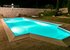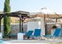 The outdoor sitting area is spacious and comfortable with sun protection around the pool.