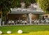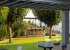The villa is surrounded by large paved areas and colorful gardens. There are beautiful areas with comfortable chairs, tables, and loungers beneath shady canopies for guests to enjoy moments of relaxation.