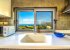 Through a door you are moving across the glass corridor, which leads you to the area of the bedrooms. Here, accommodated two large bedrooms and the main bathroom of the villa. Both bedrooms have their own closet and a shared balcony with outdoor furniture and view to the pool area. From there- as from most areas of the house – the sunset view is stunning.