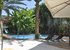 The garden is beautiful, almost a small paradise. There are lounge chairs and parasols