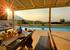 The modern open-plan kitchen accesses an outdoor shaded dining/sitting area and the poolside. The outdoor dining/sitting area offers a wooden dining table and benches and 2 sofas.