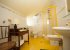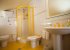 The bathroom, in the white and yellow colors, has a full stall shower, a washbasin, a bidet, a toilet and a windows opening onto the downstairs terrace.
