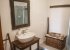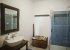 The bathroom is in between the bedrooms has no window but is broad and easy with a big blue shower.