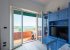 The second bedroom is a double. It comes with a matrimonial bed, a chest of drawers, 2 armchairs, an air conditioning unit and a window overlooking roofs and the sea in the distance.