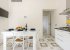 To enter the apartment, there are 3 steps. As you enter the main door, there is the open plan kitchen/dining area is warm and welcoming with beautiful, Maiolica tiles. The living area is equipped with a dining table, four chairs, an air conditioning/heating unit and a satellite TV.
