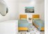 The second bedroom is accessed via the kitchen/diner. It has two single beds which can be joined to make a double bed. There is also an ensuite bathroom with a shower, sink and toilet. The bedroom is equipped with an air conditioning/heating unit.