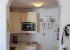 Off one side of the living room is the compact kitchen which is fully equipped with gas stovetop, microwave, dishwasher, and washing machine.