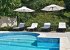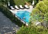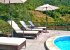 Down the stairs, beyond the stair gate, there's a large private terrace shaded by a pergola with dining table and comfy seating. Leading from the terrace there is a garden with olive groves beyond.