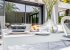 There is a chill out area with 3 outdoor sofas and coffee table as well as another dining table with 8 chairs.