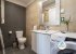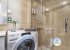 The bathroom with a modern shower cabin, a toilet, a sink and a washing machine.