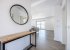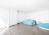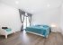 To the left of the living room is a bedroom with a bunk bed. To the right of the living room are 3 bedrooms, one