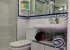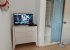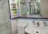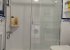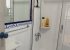 Bathroom with shower and toilet, iron and ironing board, hair dryer, storage furniture ...
