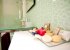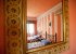 Bedroom (above), on the first floor. The bed is 1.5m wide (5'1") and 2m long (6'6"). Between bedroom and bathroom is the dressing room. The bathroom has a bath with handheld shower, basin and WC.