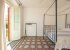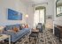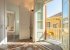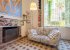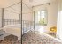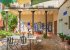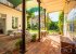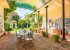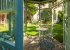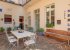 From here, doors open to the courtyard and garden, which feature a large marble-topped table, chairs, and loungers in a covered area (during the warmer months). The courtyard is decorated with beautiful tiles designed and painted by the artist himself.