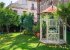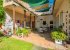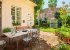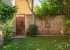 The garden includes a charming pergola as its centrepiece, surrounded by mature plants, trees, and shrubs that provide both sun and shade. There is a parking area suitable for bicycles and scooters, and a doorway leads from the garden to the street, where there is allocated parking for one vehicle plus free street parking for additional cars if needed.