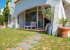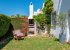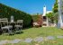 Covered terrace with table and chairs. Garden with loungers and barbecue.