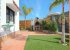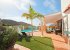 The villa's outdoor spaces include well-maintained gardens, a pool area, and a covered barbecue space with seating. There's also a sunbathing area by the pool.