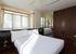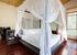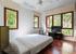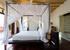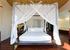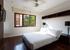The master bedroom, with its large picture windows, features a four-poster bed, an adjoining bathroom with a tub, a separate shower room, a double vanity and a small outdoor area. Because this bedroom is so spacious, there is room to set up two extra beds for two children.