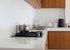 One side of the living area houses a lounge, with 48” screen smart TV; the other side has a dining space and kitchen, featuring built-in cabinets, a white marble island and standard appliances