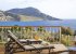 The villa is surrounded with green pines and bright blue from the sky and sea.