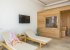 There’s an open-plan living and kitchen area with comfy sofas, a wall-mounted TV and everything you would expect to find in a home kitchen.